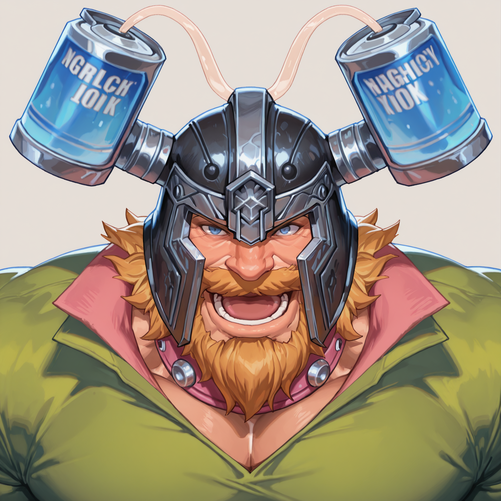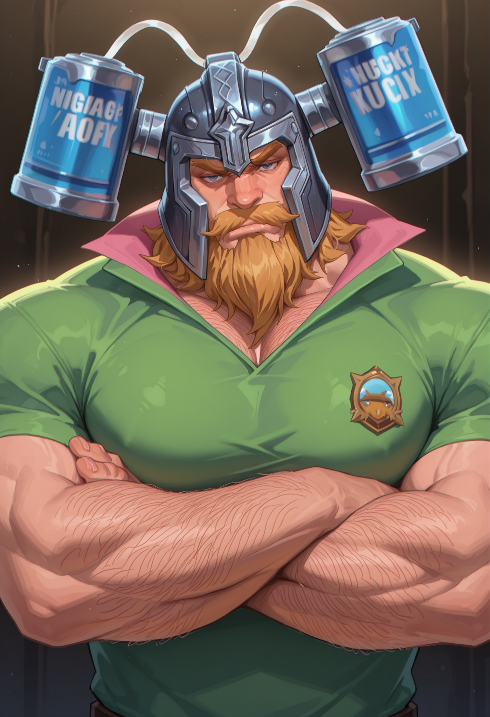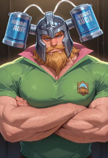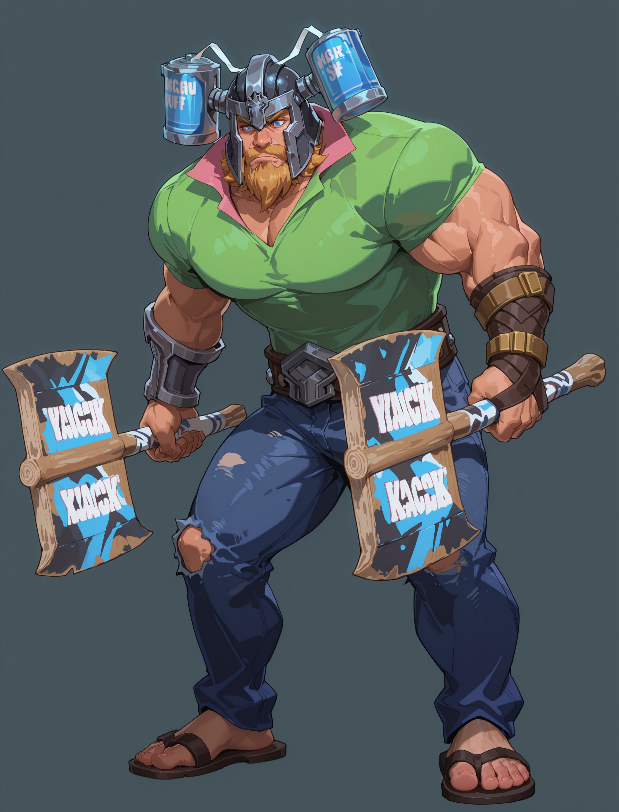 Brolaf皮肤提示:带罐头的头盔、胡须、胡子、绿色衬衫、粉色领子、腰带、护臂、(破洞)牛仔裤、凉鞋。(纸板斧头可能有效,但可能显得奇怪。)
