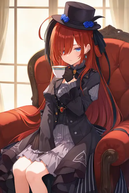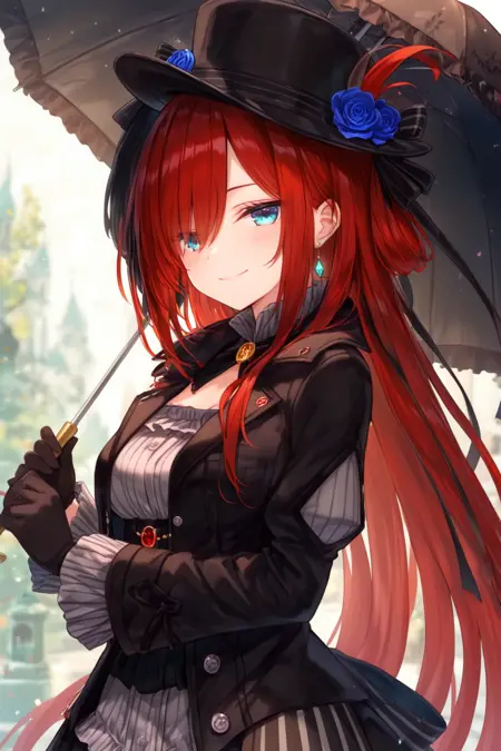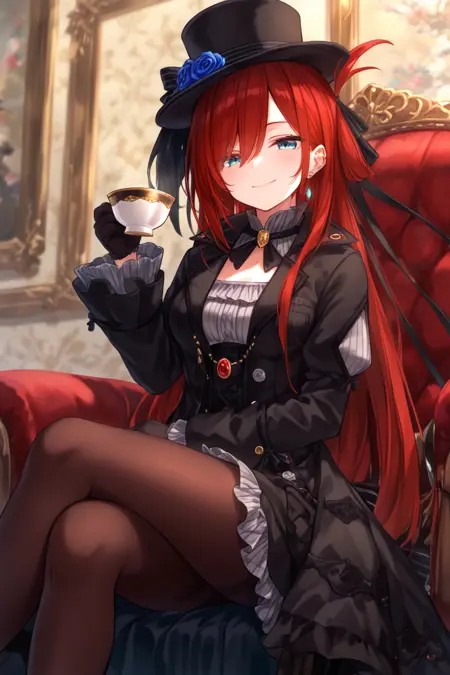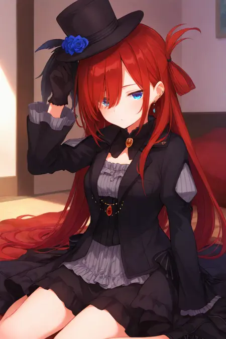 Trigger for sd15_black_dress: 1girl riviere hair over one eye, black dress, grey shirt, black gloves, black headwear, long sleeves, jewelry, top hat, hat flower