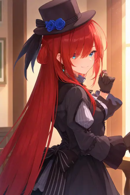 sd15_black_dress 트리거: 1girl riviere hair over one eye, black dress, grey shirt, black gloves, black headwear, long sleeves, jewelry, top hat, hat flower