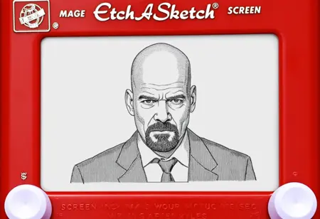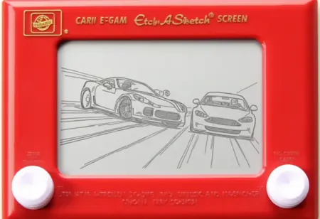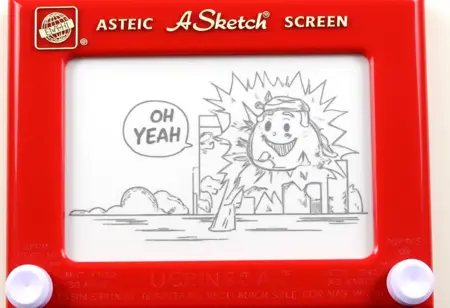 この画像は、赤い枠に囲まれたスケッチ風に描かれた詳細なドローイングで、古典的なEtch A Sketchの画面を模しています。ドローイングには (サブジェクト) が描かれています。
