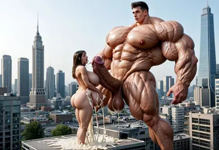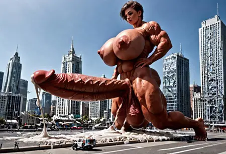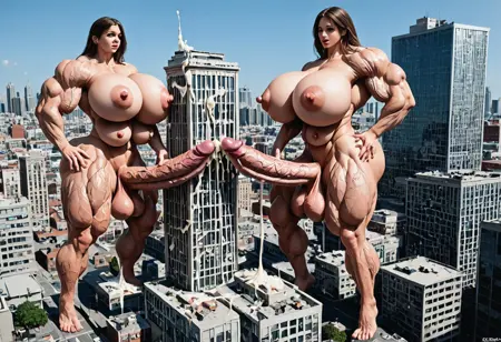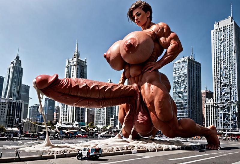 半写实风格的巨型男性、女性和双性人图像,他们身材巨大、肌肉发达,享受着新身体带来的乐趣。