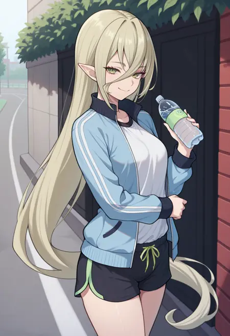 M4gil0u, green eyes, pointy ears, blonde hair, very long hair, hair between eyes