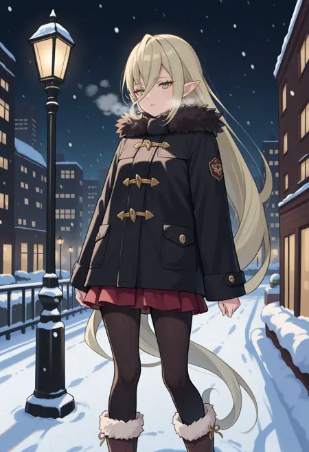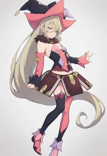 M4gil0u, green eyes, pointy ears, blonde hair, very long hair, hair between eyes, witch hat, fur collar, multicolored vest, strapless, detached sleeves, mismatched sleeves, book skirt, asymmetrical legwear, thighhighs, garter straps, mismatched footwear