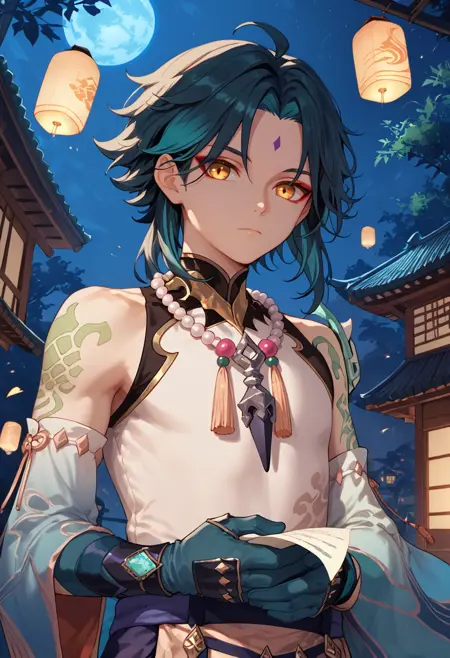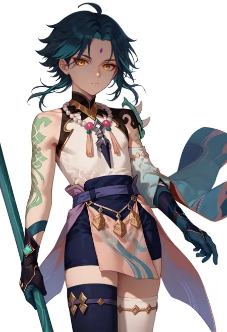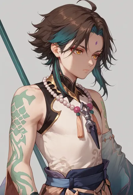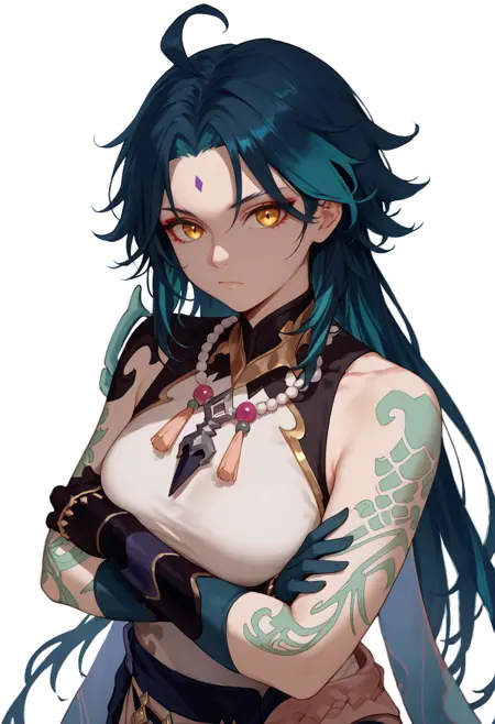 xiao, 1boy, male focus, solo, beads, jewelry, simple background, arm tattoo, bead necklace, necklace, forehead mark, facial mark, tattoo, white background, closed mouth, gloves, crossed arms, tassel, upper body, asymmetrical clothes, black gloves