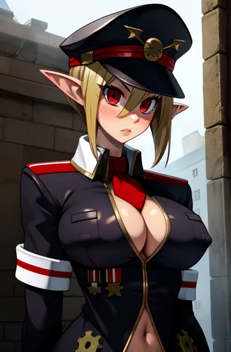 深V领,黑色军装,过膝袜,领带,白色手套,长袖带袖口,军帽,红色臂章,