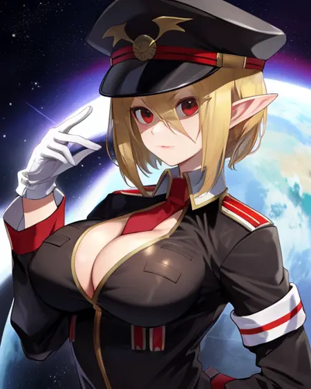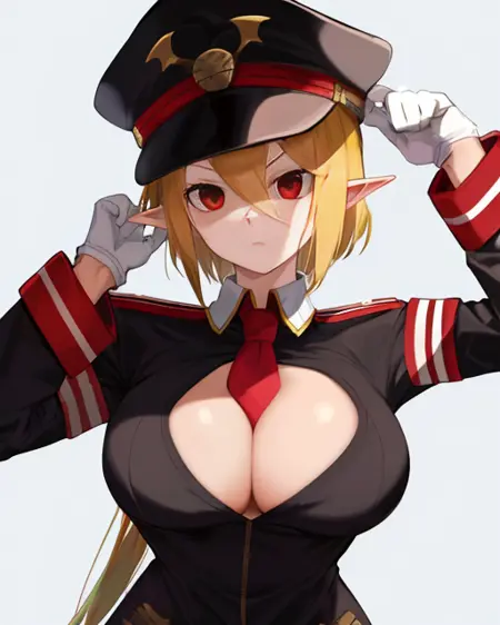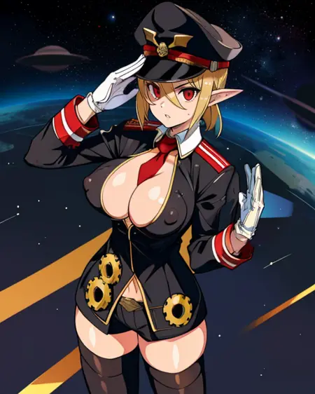 胸元、黒い軍服、太ももまであるストッキング、ネクタイ、白い手袋、 cuffs付きの長袖、軍帽、赤い腕章、