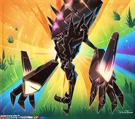And now for the main event: The light that burns the Sky, Ultra Necrozma. Having by far the largest dataset, this one should be the most versatile. The AI does seem to have a hard time understanding what's going on with the wings, but nothing a little bit of prompting can't fix. It also does have a tendency to be VERY bright since most images of Ultra Necrozma have it with an absurd amount of light coming off it, again fixed with prompting. For anthros, I recommend setting the lora to 0.8-0.7. The activation tags are "NecroU" and "Ultra Necrozma," naturally.