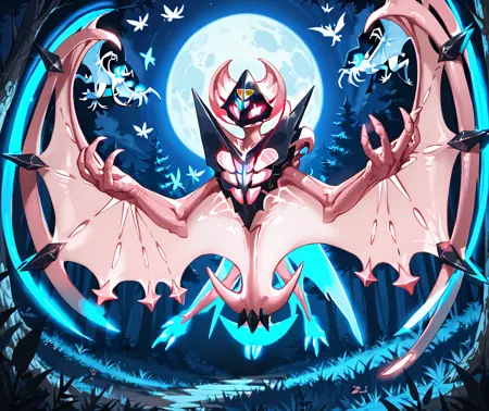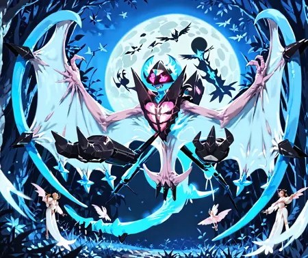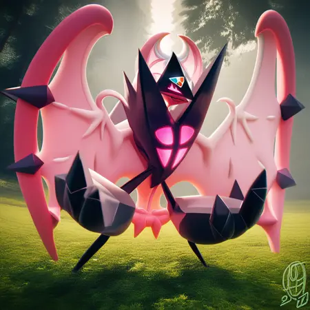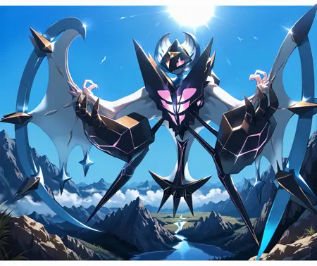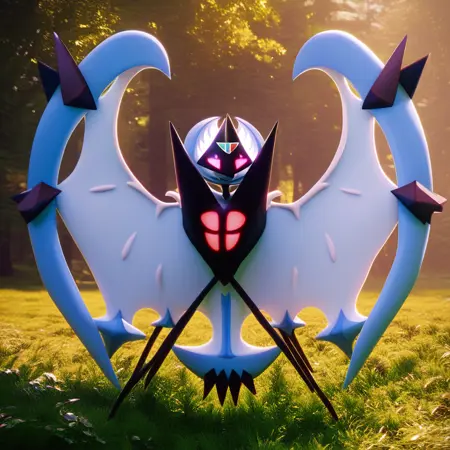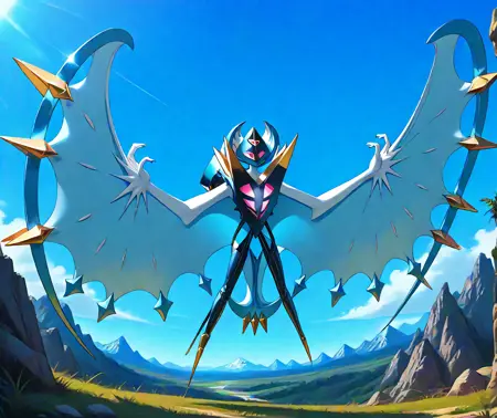 And now for the main event: The light that burns the Sky, Ultra Necrozma. Having by far the largest dataset, this one should be the most versatile. The AI does seem to have a hard time understanding what's going on with the wings, but nothing a little bit of prompting can't fix. It also does have a tendency to be VERY bright since most images of Ultra Necrozma have it with an absurd amount of light coming off it, again fixed with prompting. For anthros, I recommend setting the lora to 0.8-0.7. The activation tags are "NecroU" and "Ultra Necrozma," naturally.