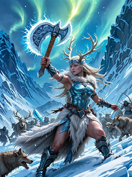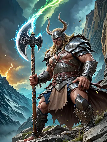 This model helps create art in a epic intense fantasy art style depicting Norse themes such as Viking Heroes of Valhalla, Valkyries, Shieldmaidens, Dragons, Norse Gods, and awe-inspiring battlefields.