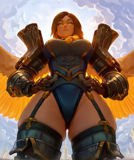 thighhighs, garter straps, pauldrons, armor high heels, leotard, gauntlets,