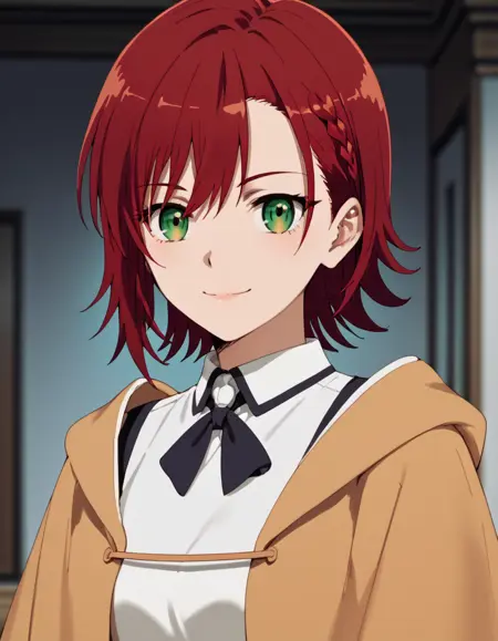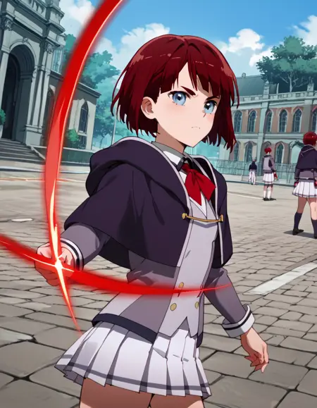 mabelcrane_red, blue eyes, red hair, short hair, school uniform, capelet, pleated skirt,
