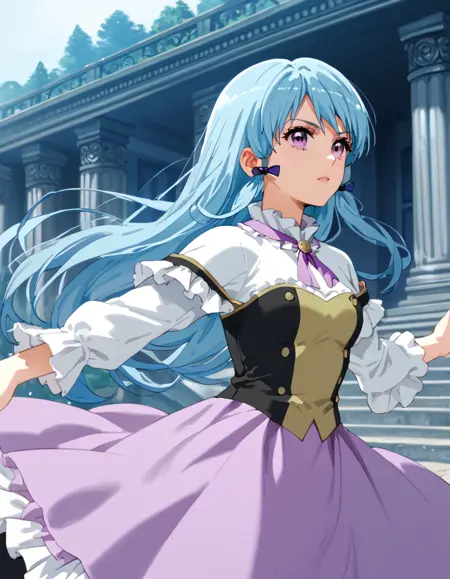 fionaurdalegreif, purple eyes, blue hair, long hair, dress,