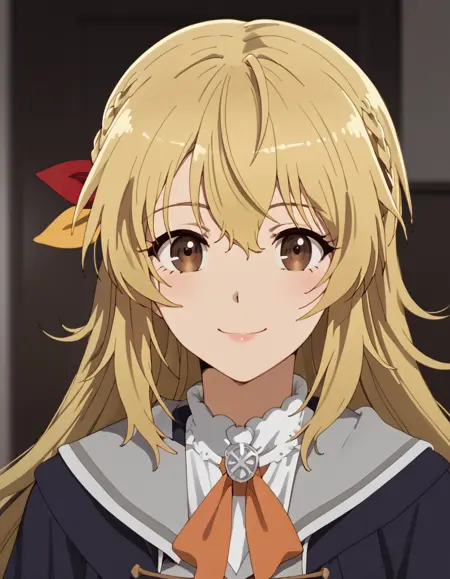 yifa, brown eyes, blonde hair, long hair, school uniform, capelet, ribbon, braid, hair ribbon, pleated skirt, white skirt, blush,