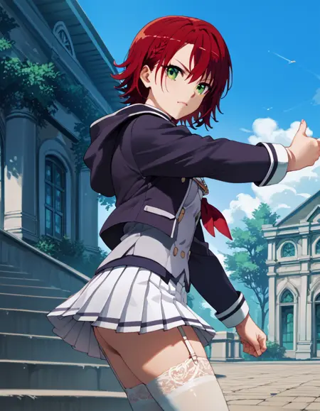 amyu, green eyes, red hair, short hair, school uniform, garter straps, pleated skirt, white thighhighs, thighhighs,