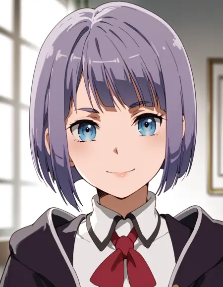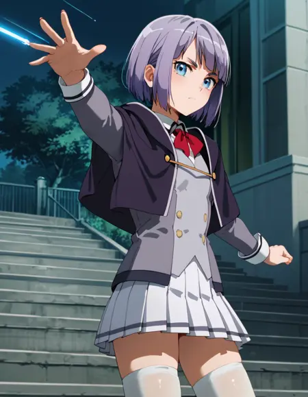 mabelcrane, blue eyes, purple hair, short hair, school uniform, capelet, thighhighs, white thighhighs, pleated skirt, long sleeves, miniskirt, bangs, buttons,