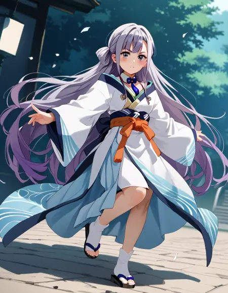 yuki, grey hair, purple hair, multicolored hair, long hair, very long hair, japanese clothes, wide sleeves, long sleeves, tabi, bangs, blush,