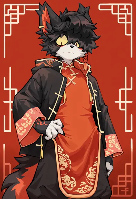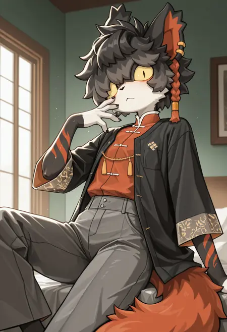 Illustrious: best quality, amazing quality, very aesthetic, absurdres, newest, aak, h341ing_h4nd, evi1_h34rt, furry, furry male, solo, yellow sclera, pants, looking at viewer