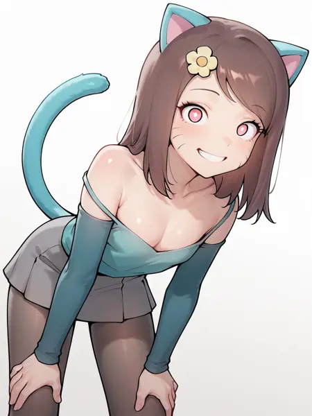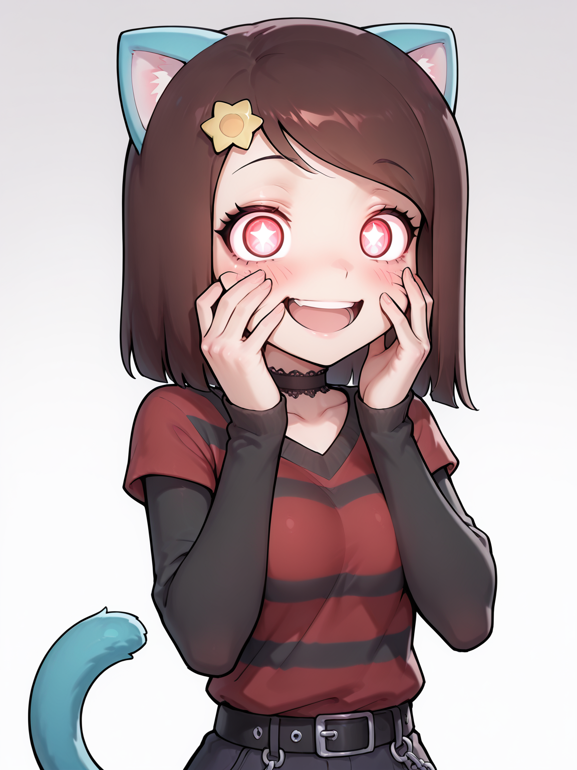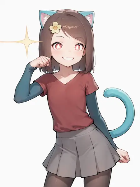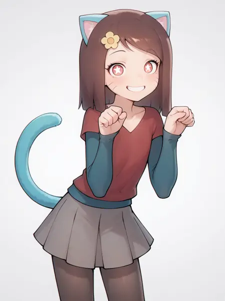 gumball-girl, 수염 무늬 또는 얼굴 무늬, 별 모양의 동공, 고양이 귀, 고양이 꼬리, 셔츠, 긴 소매 위에 짧은 소매, 회색 치마, 팬티스타킹