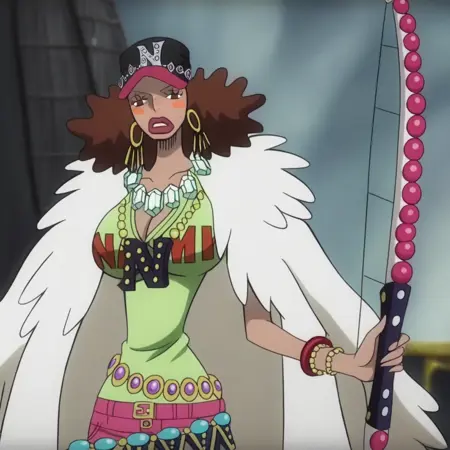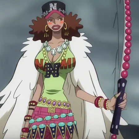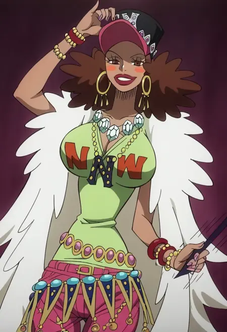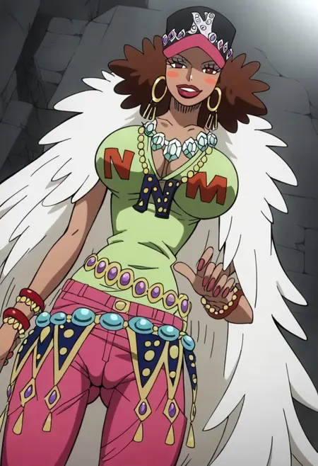 NaomiDrunkOP, 1girl, solo, slim woman, brown hair, afro, hat, earrings, makeup, lips, lipstick, brown hair, very dark skin, large breast, jewelry, necklace, cleavage, light green shirt, pink pants, shoes, belt, bracelets, jewerly ornament, rings, fur coat, quiver, bow (weapon), blush stickers, cape, beads, the word "NAOMI" on shirt, necklace with the letter "N" on it, drunk,