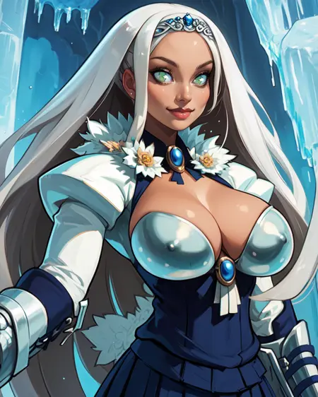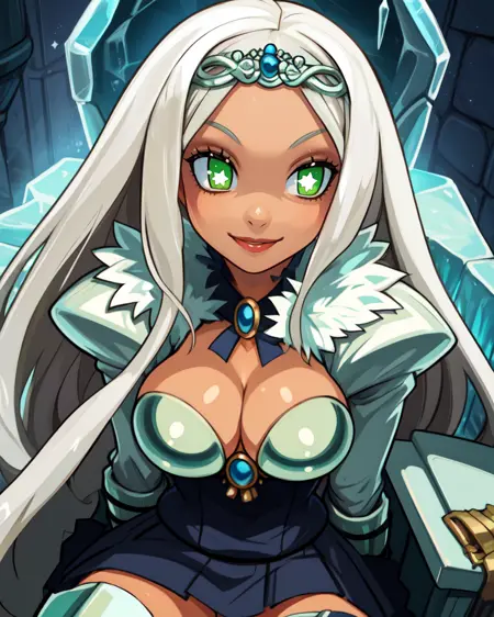 ティアラ、手甲、鎧付き太もも長ズボン、胸元の開き、スカート、白い毛皮の縁取り、鎧