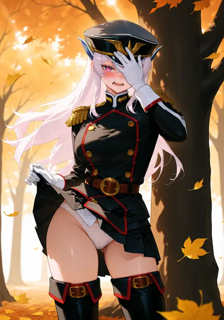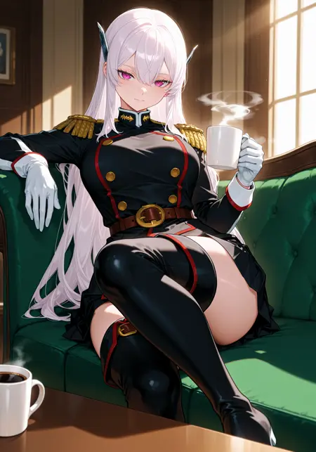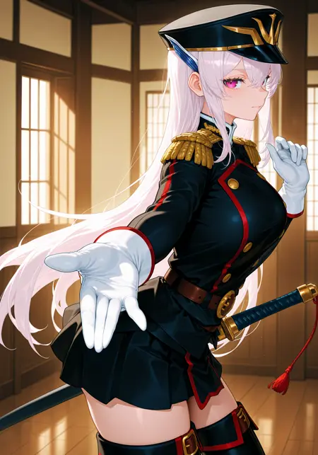 - military hat, black military uniform, epaulettes, brown belt, black skirt, white gloves, thigh boots