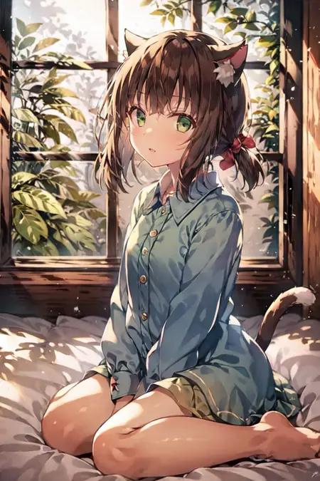 트리거 단어: mutsuki\(azur_lane\), 유치원 복장, 트윈테일, 학교 모자, 노란 치마, 갈색 머리, 녹색 눈, 고양이 귀, 고양이 꼬리,