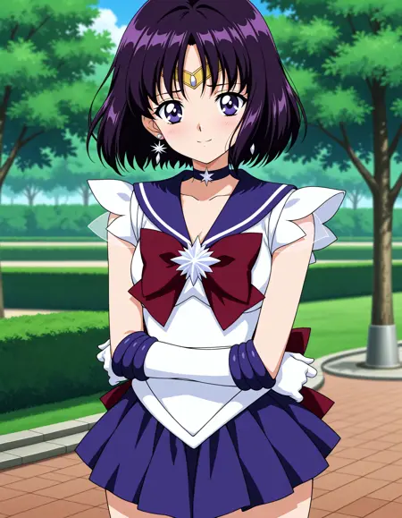 トリガー単語: セーラーさturn、紫の目、短い髪、紫の髪、輪飾り、ブローチ、チョーカー、イヤリング、手袋、ジュエリー、魔法少女、ミニスカート、紫のセーラー衿、セーラー衿、セーラー戦士ユニフォーム、スカート、星のチョーカー、白い手袋、