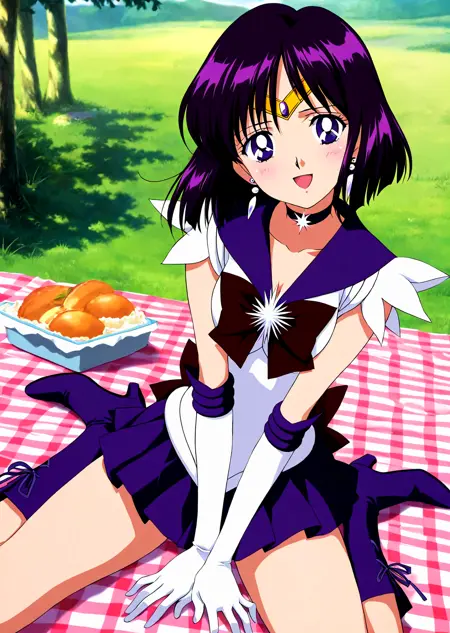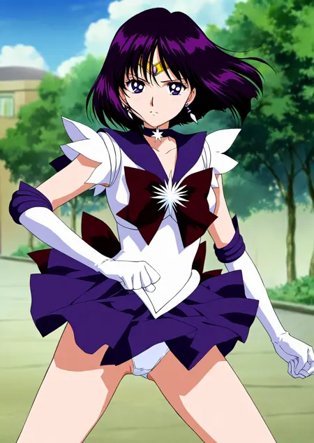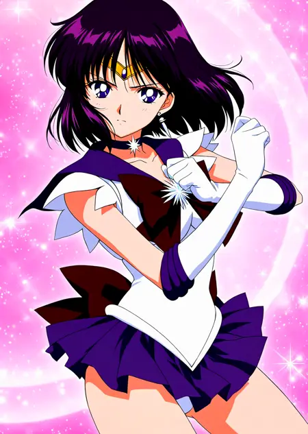 Trigger Word: sailor saturn,purple eyes,short hair,purple hair,circlet,brooch,choker,earrings,gloves,jewelry,magical girl,miniskirt,purple sailor collar,sailor collar,sailor senshi uniform,skirt,star choker,white gloves,