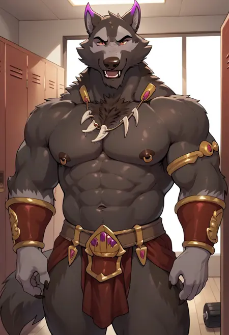 主要触发词:Ranzkai、狼魔、金色扣环、骨制项链、臂甲、红色兜裆布、棕色腰带、蹄子