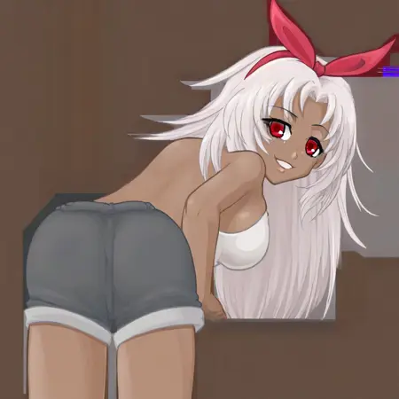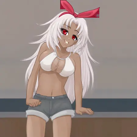 calihushhush, 1girl, solo, long hair, breasts, dark-skinned female, smile, navel, white hair, shorts, red eyes, single bow, hair bow,