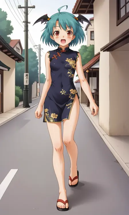 bangohan, 1girl, red eyes, blue hair, short hair, ahoge, head wings,
