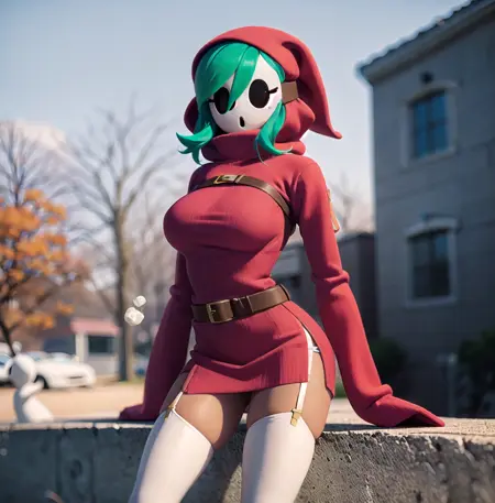 red dress, boots, brown belt, green hair, white thighhighs, garter straps, blue footwear (sleeves past fingers, sleeves past wrists), large breasts