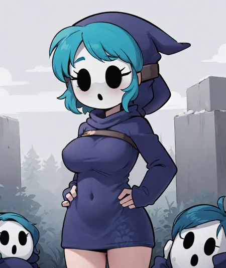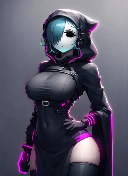 1girl, dress, hood, mask, hollow eyes