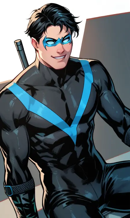 Nightwing,1boy,solo,black hair,short hair,domino mask,no pupils,black and blue bodysuit,superhero,