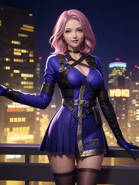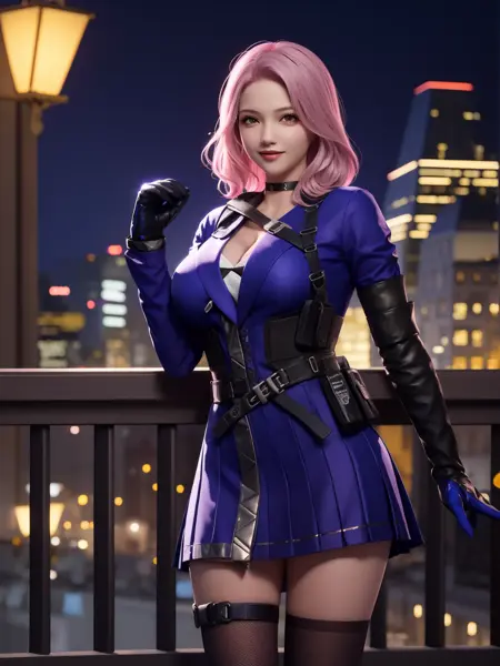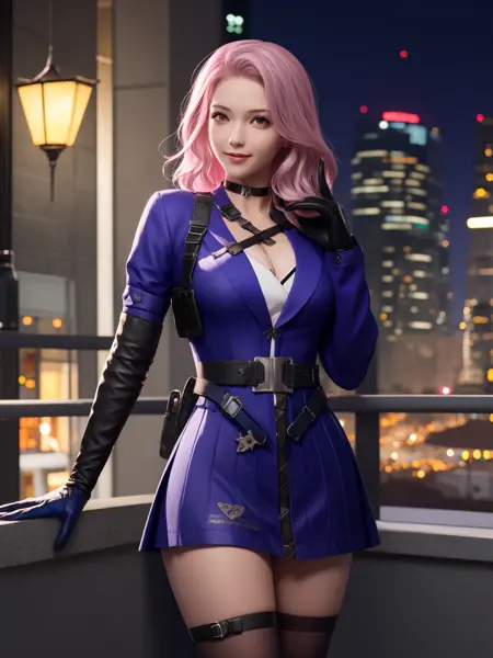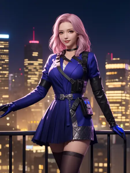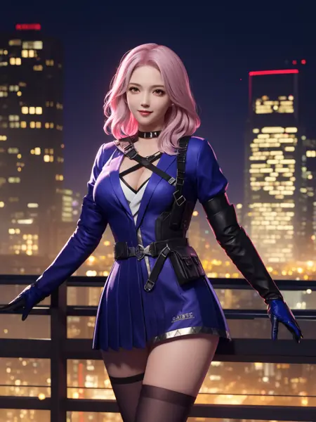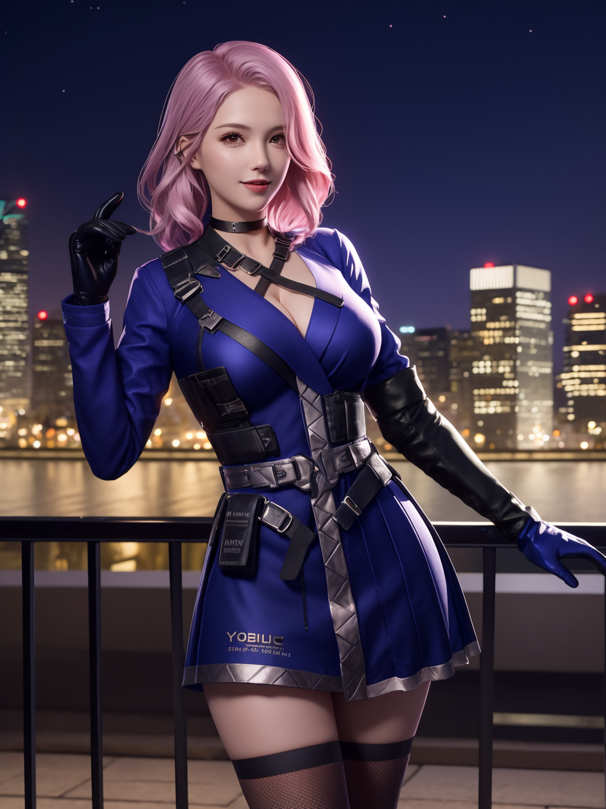 - CFyunyouyou, 1girl,solo, gloves, pink hair, choker,dress,elbow gloves, black thighhighs, medium hair,belt,holster,looking at viewer, cityscape, night, pool,cowboy shot,