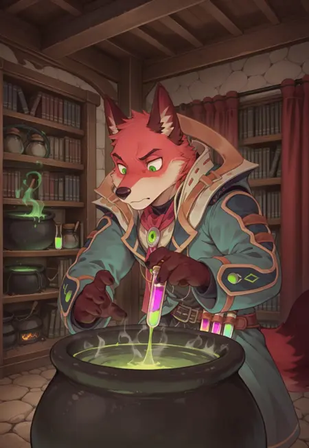 提示词: lambert, fox boy, green eyes, tail