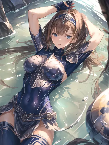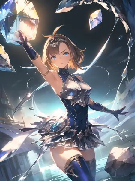 棕髪(金髪)、短髪、あほ毛、ヘアバンド、青い目、ボディスーツ、胸板、肩装甲、手袋、スカート、タイツ、(ブーツ)