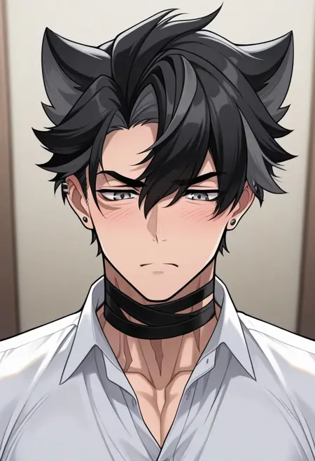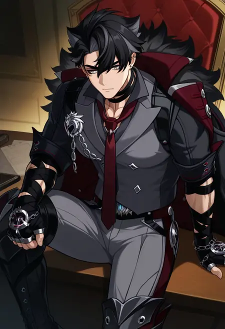 Wriothesley, 1boy, male focus, solo, grey eyes, black hair, hair between eyes, short hair, multicolored hair, streaked hair, scar, scar on neck, jewelry, earring, choker, necktie, red necktie, shirt, collared shirt, grey shirt, vest, double-breasted, buttons, sleeves rolled up, gloves, black gloves, fingerless gloves, bandages, black bandages, bandaged arm, jacket, lapels, coat, black coat, coat on shoulders, fur trim, fur-trimmed coat, belt, pants, grey pants, boots, knee boots, black footwear,