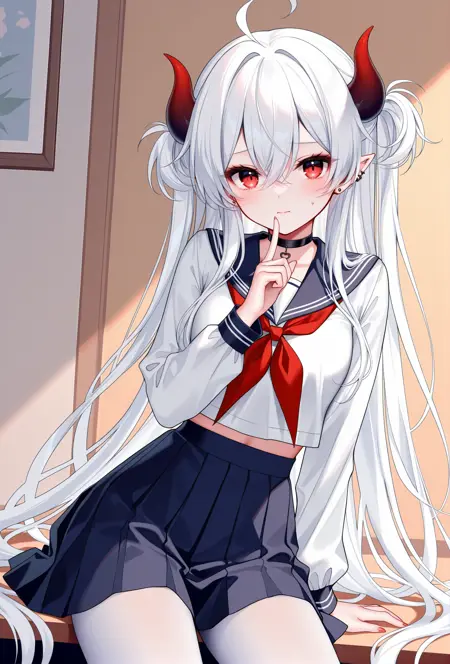 关键词:mao(ts)、1girl、solo、红眼睛、恶魔角、白发、呆毛、极长发、尖耳、耳饰