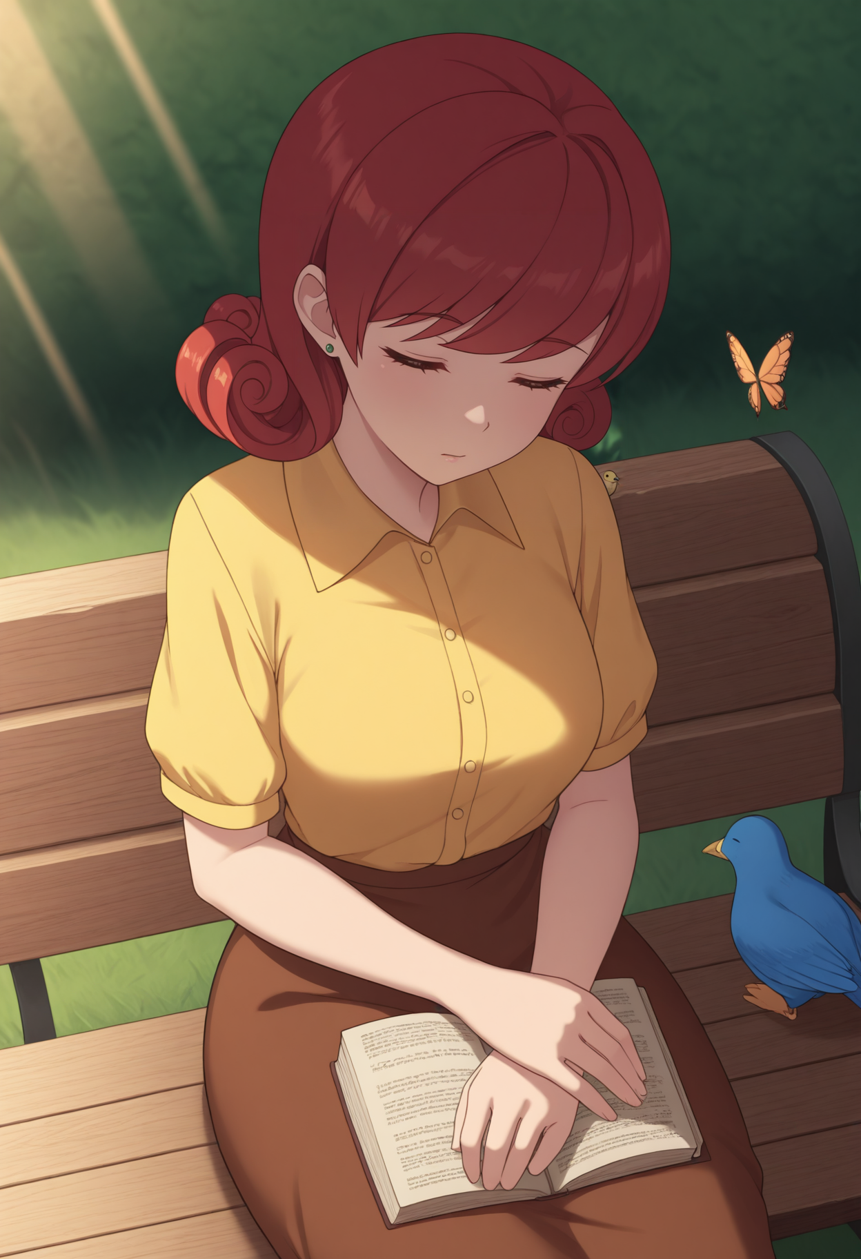 彼女のメイン衣装には以下を使用してください:NSPennyBase、緑の目、ミディアムヘア、赤髪、カールヘア、緑のピアス、黄色のシャツ、襟付きシャツ、短袖、茶色のスカート
