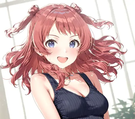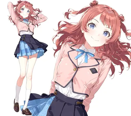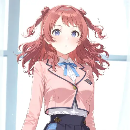 hanami saki, idolmaster, double bun, hair bun, red hair, blue eyes, long hair, medium breasts