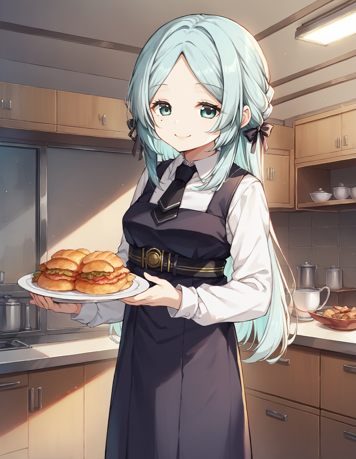 Casual outfit: mgrctokisunao, long hair, white shirt, black hair bows, black tie, blue pinafore dress, black belt