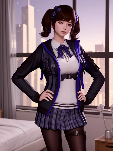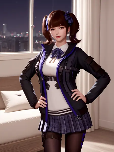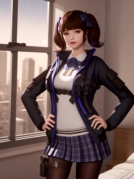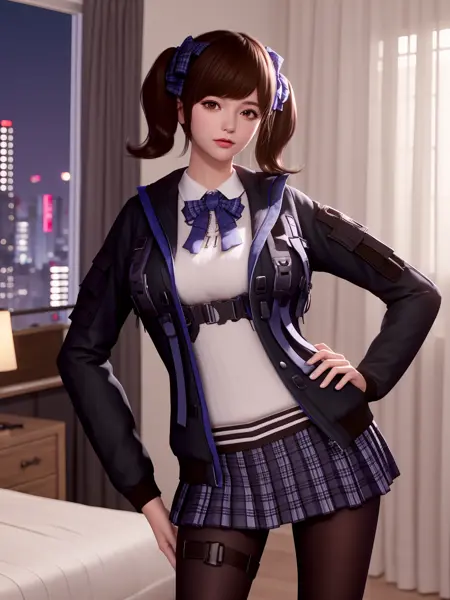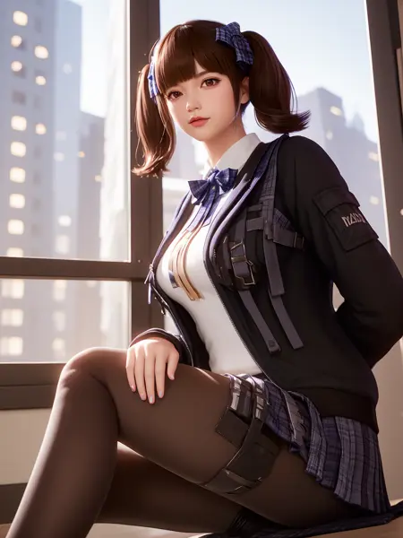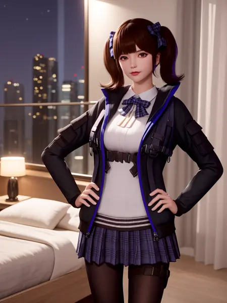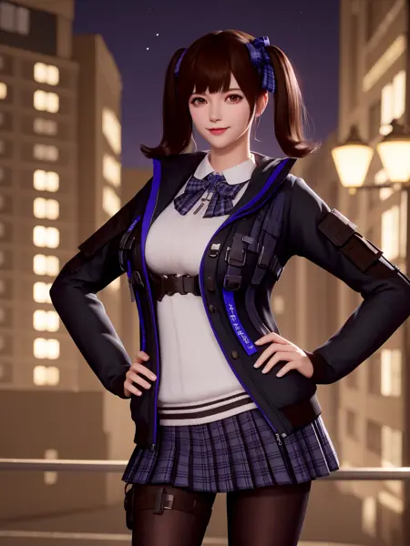 - CFguanxiaoyuBWZ, 1girl, solo, pantyhose, brown hair, twintails, brown eyes, looking at viewer, bangs, plaid skirt, open jacket, pleated skirt, breasts, long hair, lips, bow, open clothes, ribbon, hairclip, hair bow, long sleeves, cityscape, night, hand on hip, short hair, thigh holster,