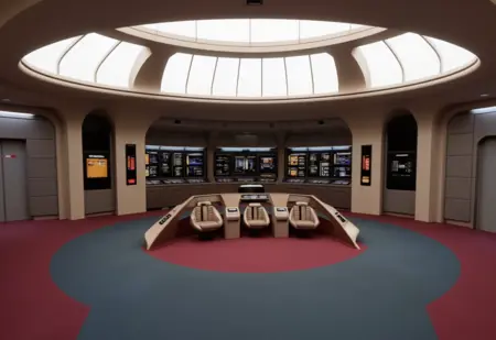 银河级舰桥空间开阔、布局优雅,舰长座椅两侧分别是第一军官与顾问席位,强调协作精神。前方的航向与操作控制台提供精准控制,而巨大的主观景窗则展现出壮丽的星空。环绕的工作站、符合人体工学的LCARS界面,以及温暖的地毯式设计,在效率与舒适之间取得完美平衡,反映出“企业号-D”作为旗舰及船员与家属家园的双重角色。