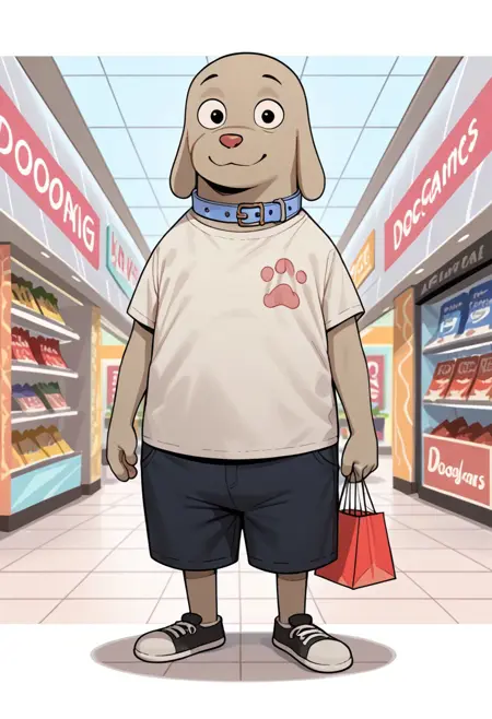 Keywords: DogVaron, 1boy, solo, dog, beige fur, round eyes, small eyebrowns, pink nose, blue collar
