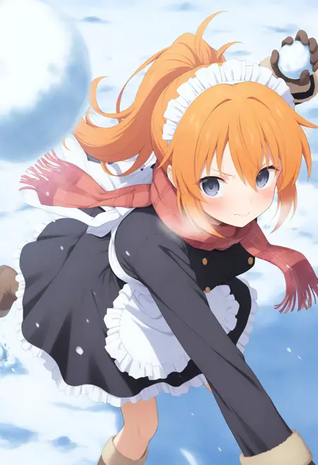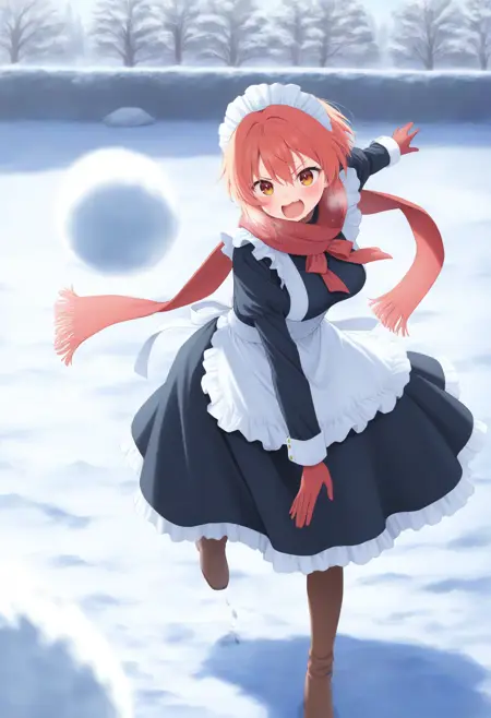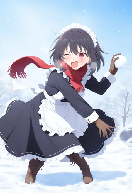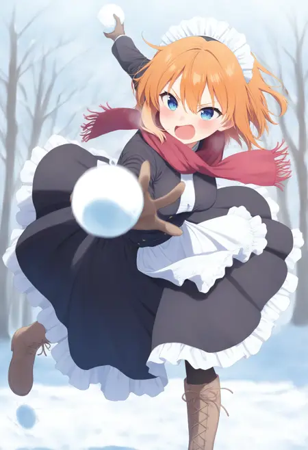 元から学習済みのプロンプトですが飛び交う雪玉の中で雪玉握ってるだけになりがちなのを投げた雪玉と思いっきり投げた体勢に矯正します。トリガーだけでも問題ありませんが winter, winter clothes, gloves, scarf, long sleeves, breath,throwing, outstretched arms, standing, standing on one leg, leg up, spread arms, outstretched arm, blurry foreground, leaning forward, motion blur 辺りから必要なものと指定すればそれっぽいかと思います。