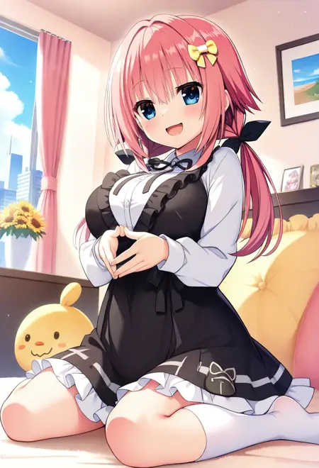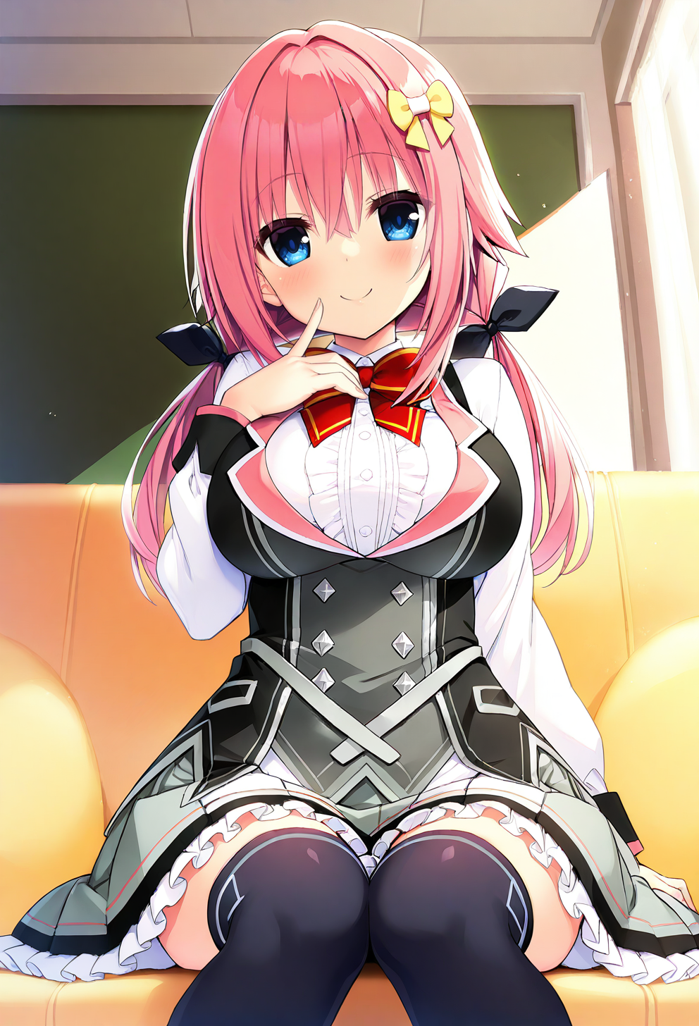 kano-default,blue eyes,pink hair,hair ornament,twintails,long hair,school uniform,red bow,frilled shirt,frilled skirt,black thighhighs,black loafers