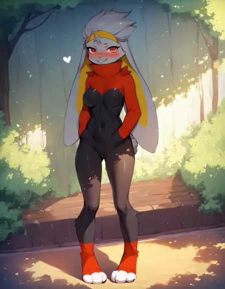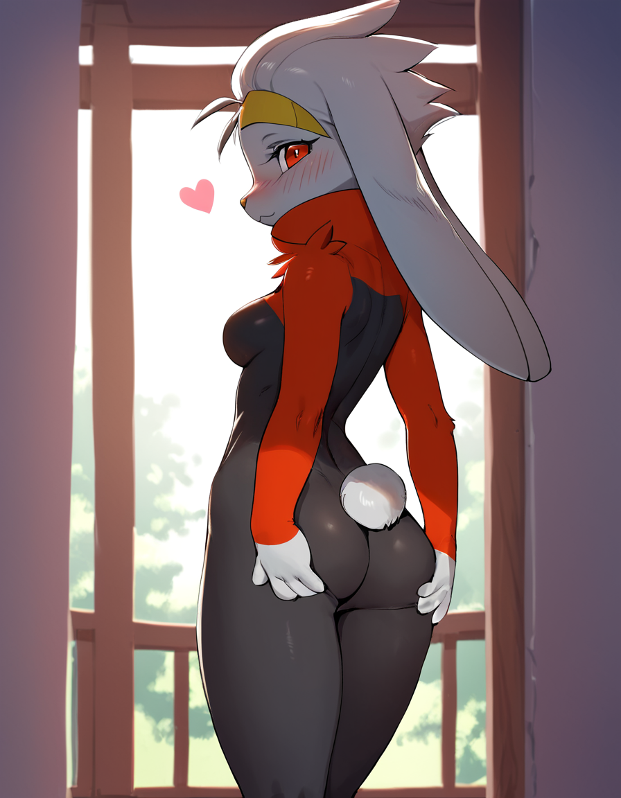 score_9, score_8_up, score_7_up, r@boot, 1girl, animal nose, breasts, covered navel, solo, furry female, hetero, pokemon \(creature\), rabbit ears, red eyes, short hair, solo focus, bodysuit, animal paws, grey hands, red feets