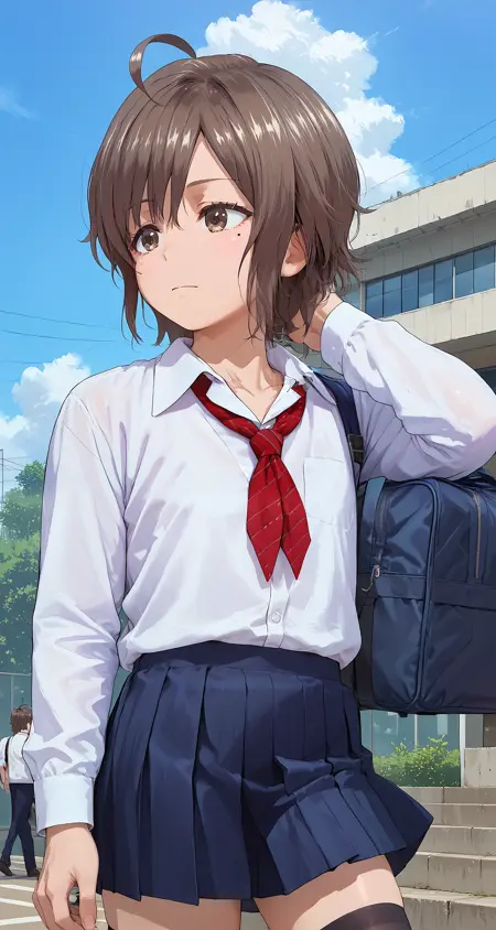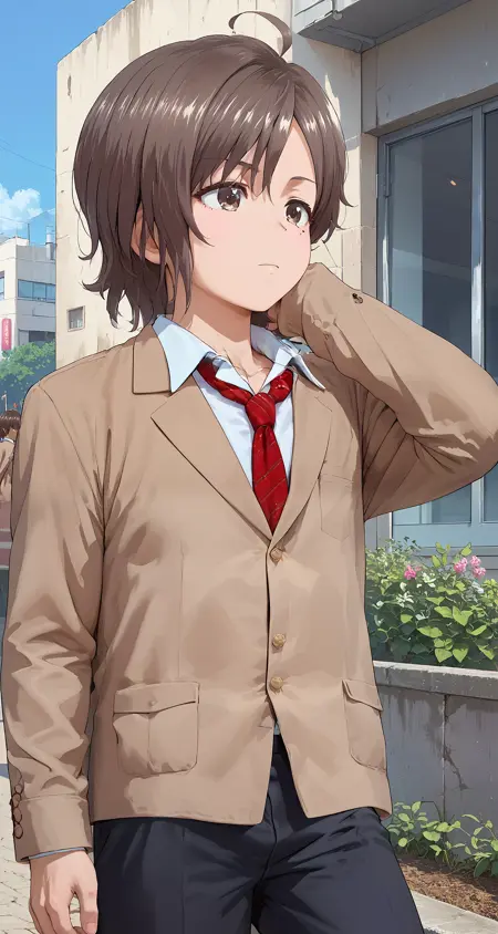 학교 유니폼, 흰 셔츠, 갈색 재킷, 넥타이, 검은 바지,