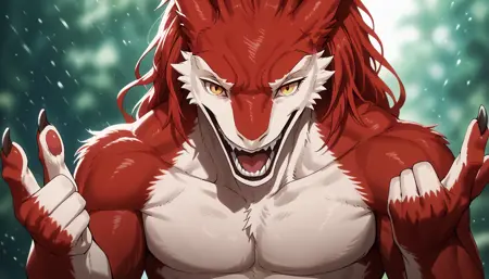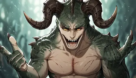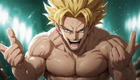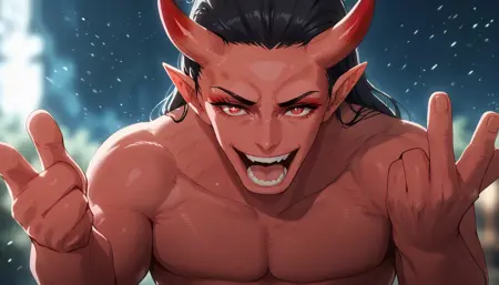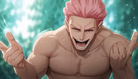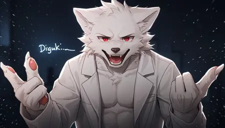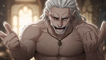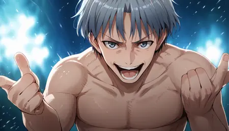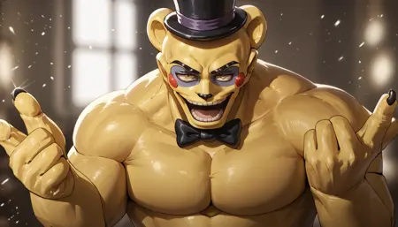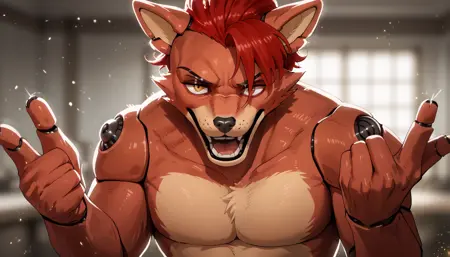 blurry background, looking at viewer, smirk, meme, parody, open mouth, topless